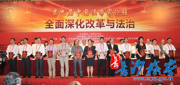 会议表彰了第九届中国法学家论坛征文获奖作者和优秀组织单位,人人体育直播 被中国法学会评为“第九届中国法学家论坛征文优秀组织单位”,系获奖十四家优秀组织单位中两个检察机关之一,这也是我院首次获得该项荣誉。在本次征文活动中,我院领导高度重视,研究室积极组织全市检察干警认真撰写论文,共选送了二十余篇论文参加了第九届中国法学家论坛,得到了中国法学会的充分肯定和高度评价。