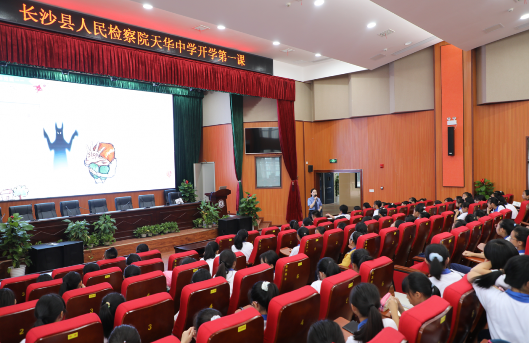 9月14日,长沙县检察院“星沙检察青年说”普法宣讲团成员张晓芸从性侵害的相关概念、防范性侵害的误区、对性侵害的错误观念等方面为长沙县天华中学约200名初一女生上了一堂名为《关于性侵害,我们可能不知道的那些事》的法治课。