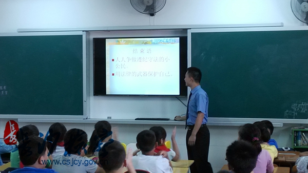2014年10月9日,天心区检察院检察官喻曦、李利军一行到天心区青园小学五三班上了一堂生动的法制教育课。针对小学生的个性特点,喻曦首先与孩子们一起观看了“法律伴我成长”的卡通片,接着采取提问互动形式给孩子们分析了考试作弊、偷拿他人财物等不良习惯可能导致的严重危害,结合多媒体视频列举了打架斗殴、盗窃等经典案例,并与孩子们分享拾金不昧、遵守公共秩序的身边故事。