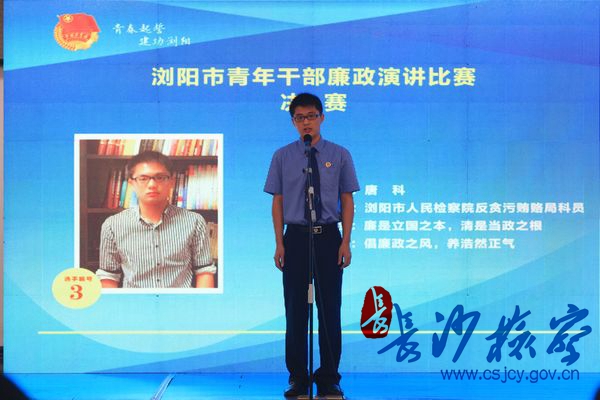 7月17日,由中共浏阳市纪委、共青团浏阳市委主办的“浏阳市青年干部廉政演讲比赛”决赛在浏阳市政务中心三楼会议室举行。浏阳市检察院反贪污贿赂局青年干警宣泽宏、唐科经过初赛,从来自浏阳各市直机关、乡镇街道的68位选手中脱颖而出顺利进入决赛。长沙市副市长、浏阳市委书记曹立军,共青团长沙市委副书记赵雪峰等领导担任比赛评委。