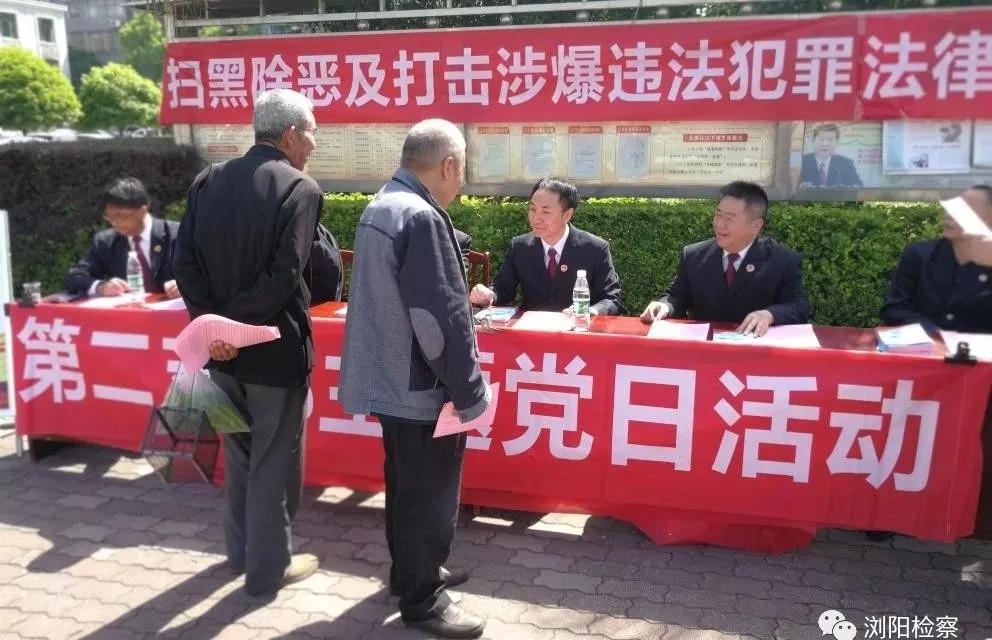 4月18日,浏阳市人民检察院侦监、控申、监所、监察等部门干警,联合大瑶镇政府、公安等相关部门,在大瑶镇百姓广场开展“扫黑除恶、打击涉爆刑事犯罪,确保人民安居乐业”为主题的法治宣传活动,拉开浏阳市人民检察院在浏阳市乡镇开展“扫黑除恶”巡回法治宣传的序幕。