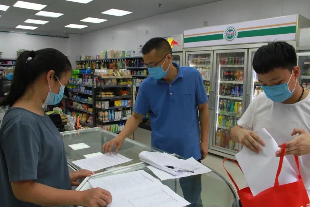雨花区检察院的志愿者拿着信、通告和回执单走进商铺和企业发放疫情防控资料并宣传讲解疫情防控有关要求和知识。