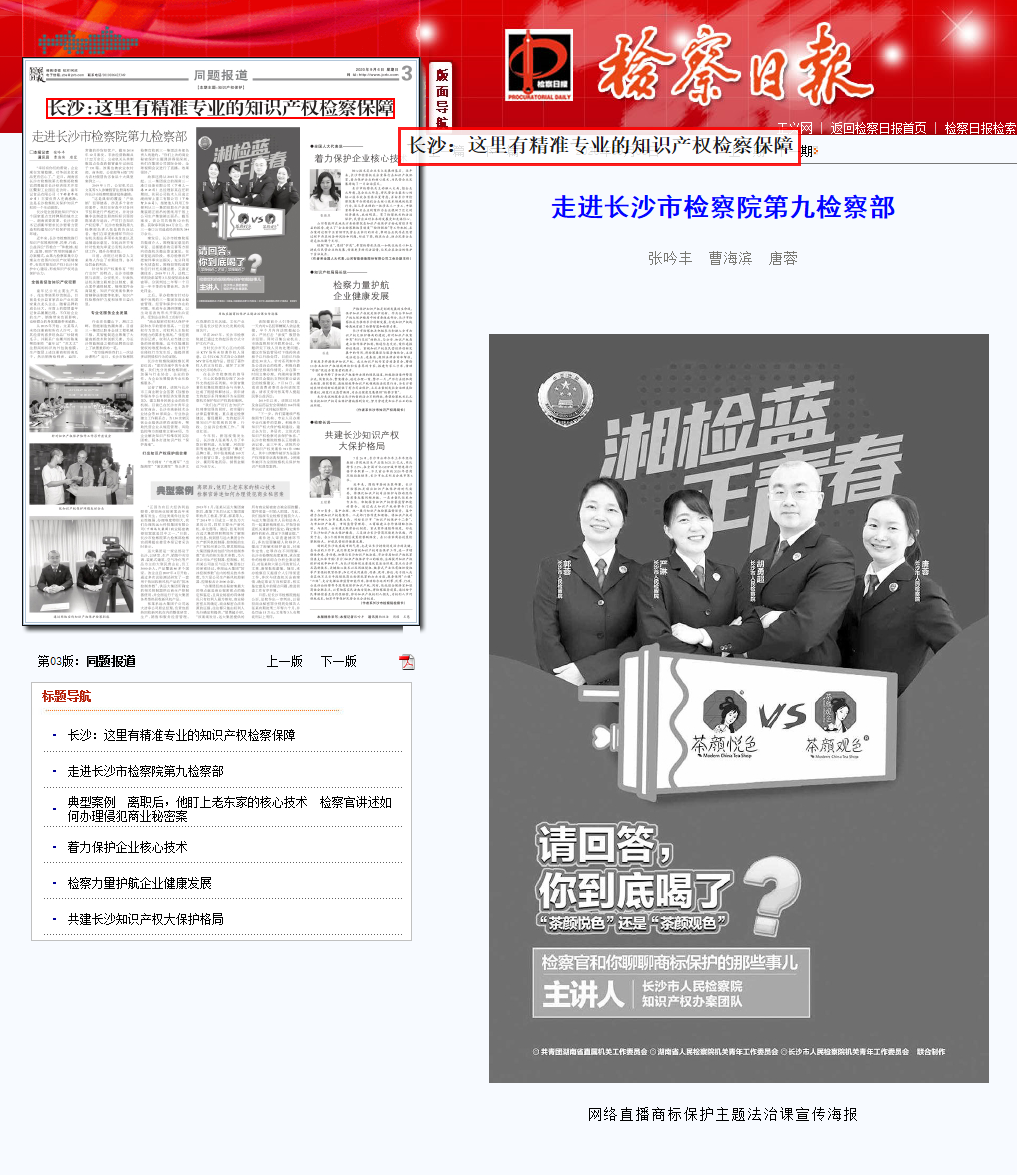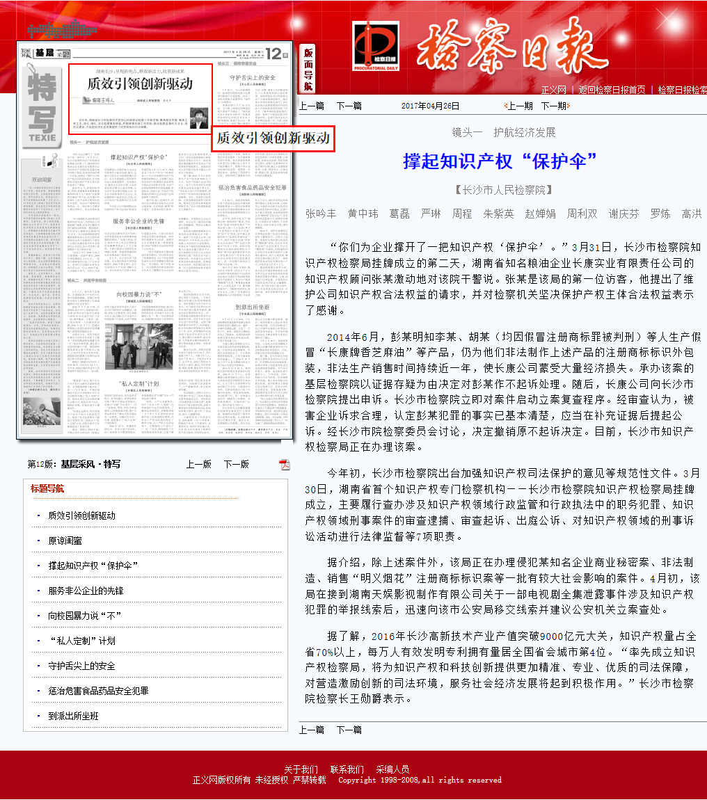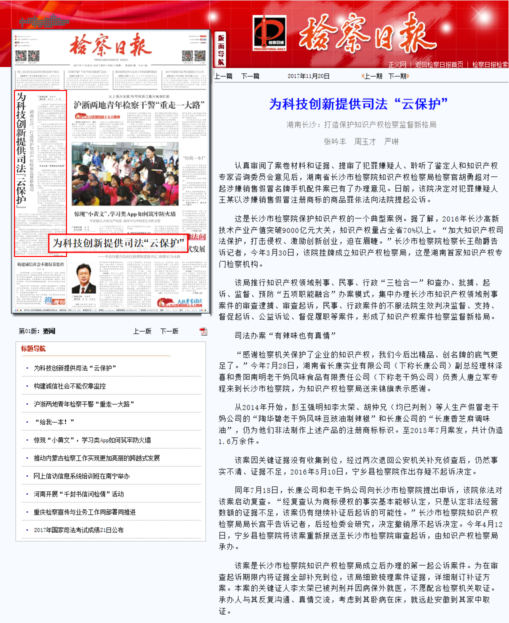 《检察日报》在头版头条以《湖南长沙:打造保护知识产权检察监督新格局 为科技创新提供司法“云保护”》为题推介长沙市检察院知识产权检察局工作经验。长沙市检察院党组书记、检察长王勋爵表示,“我们要继续严格按照专门机构、专业人员办理专业化案件的思路,打出知识产权保护组合拳,撑起知识产权‘保护伞’,为‘创新引领、开放崛起’湖南战略提供强有力的司法保障。”
