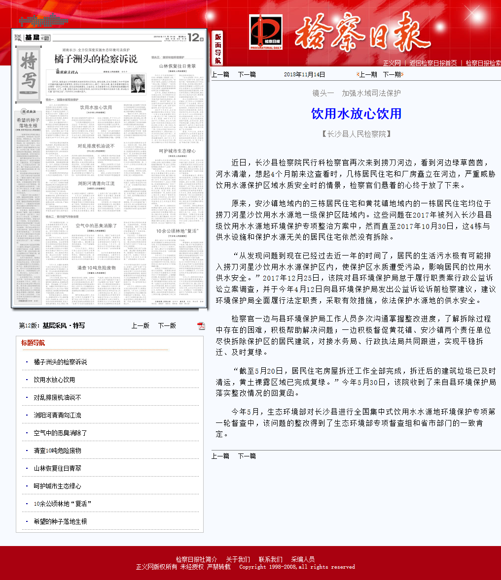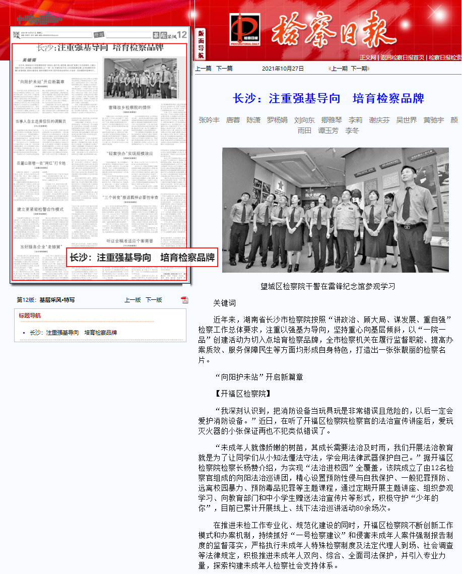 近年来,长沙市检察机关按照“讲政治、顾大局、谋发展、重自强”检察工作总体要求,注重以强基为导向,坚持重心向基层倾斜,以“一院一品”创建活动为切入点培育检察品牌,全市检察机关在履行监督职能、提高办案质效、服务保障民生等方面均形成自身特色,打造出一张张靓丽的检察名片。10月27日,《检察日报》对长沙市检察机关“一院一品”创建活动进行了专版专题报道。