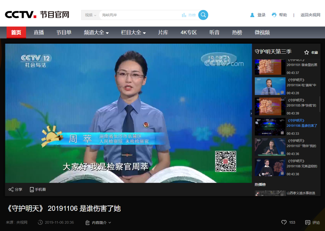 《守护明天》第三季由最高检和中央广播电视总台联合制作,在CCTV社会与法频道播出;《是谁伤害了她》主讲人:长沙市岳麓区检察院周萃。