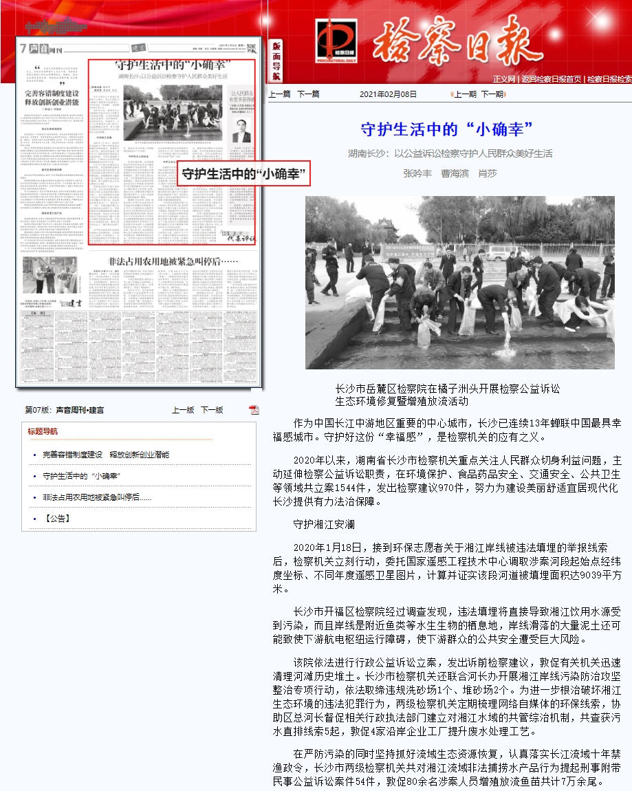 近年来,湖南省长沙市检察机关始终坚持生态优先、绿色发展,在生态检察工作中牢固树立双赢多赢共赢的监督理念,坚持以司法办案为中心,推行一体化办案、重大监督事项案件化办理等一系列工作机制,综合运用检察建议、公益诉讼、生态修复等方式,积极构筑检察履职有效治理水、大气、土壤、湿地污染的立体防护体系,加大对生态环境的司法保护力度,坚决助力打赢“蓝天保卫战”,守护好长沙的碧水蓝天。