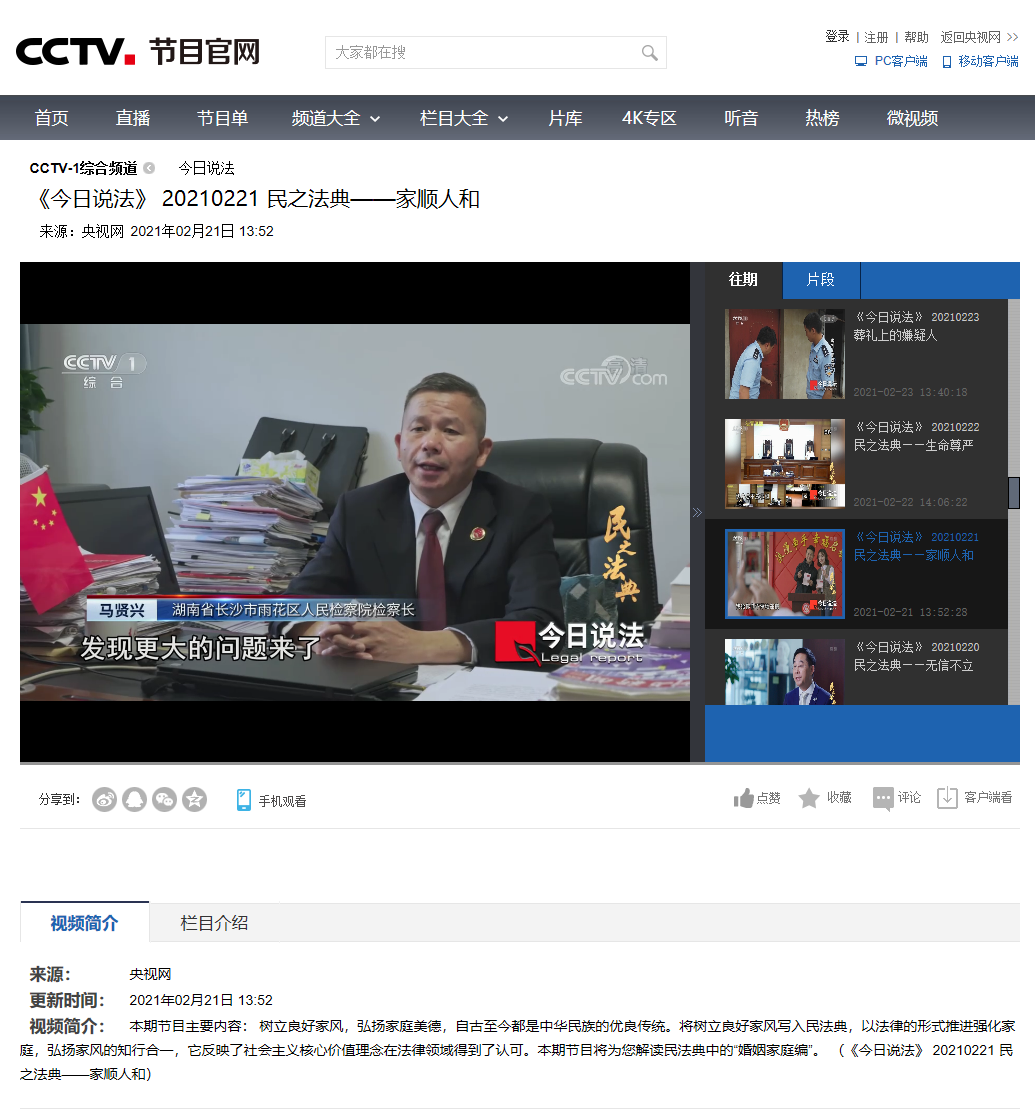 2月21日,央视综合频道《今日说法》栏目播出的《民之法典》第四集“家顺人和”,报道了由长沙市检察院和雨花区检察院共同办理的钟敏(化名)夫妻共同债务纠纷一案,时长共11分钟。其中雨花区检察院时任党组书记、检察长马贤兴和员额检察官罗大钧分别就夫妻共债共签司法认定规则、相关民事案件的抗诉监督进行了法律解读。