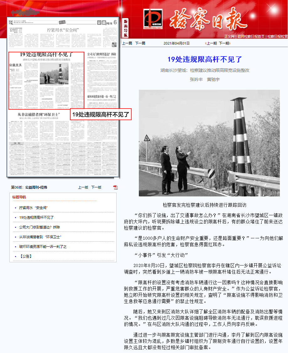 4月1日,《检察日报》刊发《19处违规限高杆不见了》一文,文中报道了望城区检察院发出全省首份消除限高设施安全隐患检察建议背后的办案故事。