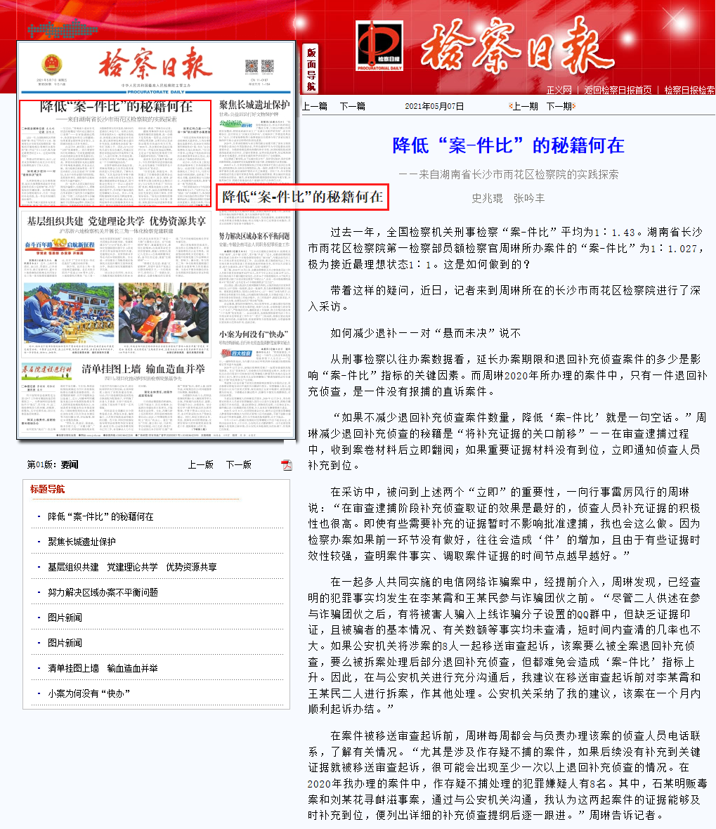 过去一年,全国检察机关刑事检察“案-件比”平均为1∶1.43。长沙市雨花区检察院第一检察部员额检察官周琳所办案件的“案-件比”为1∶1.027,极为接近最理想状态1∶1。这是如何做到的?