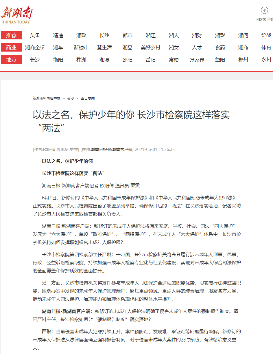 6月1日,新修订的《中华人民共和国未成年保护法》和《中华人民共和国预防未成年人犯罪法》正式实施。长沙两级检察院举办了以“检爱同行 共护未来”为主题的检察开放日活动。