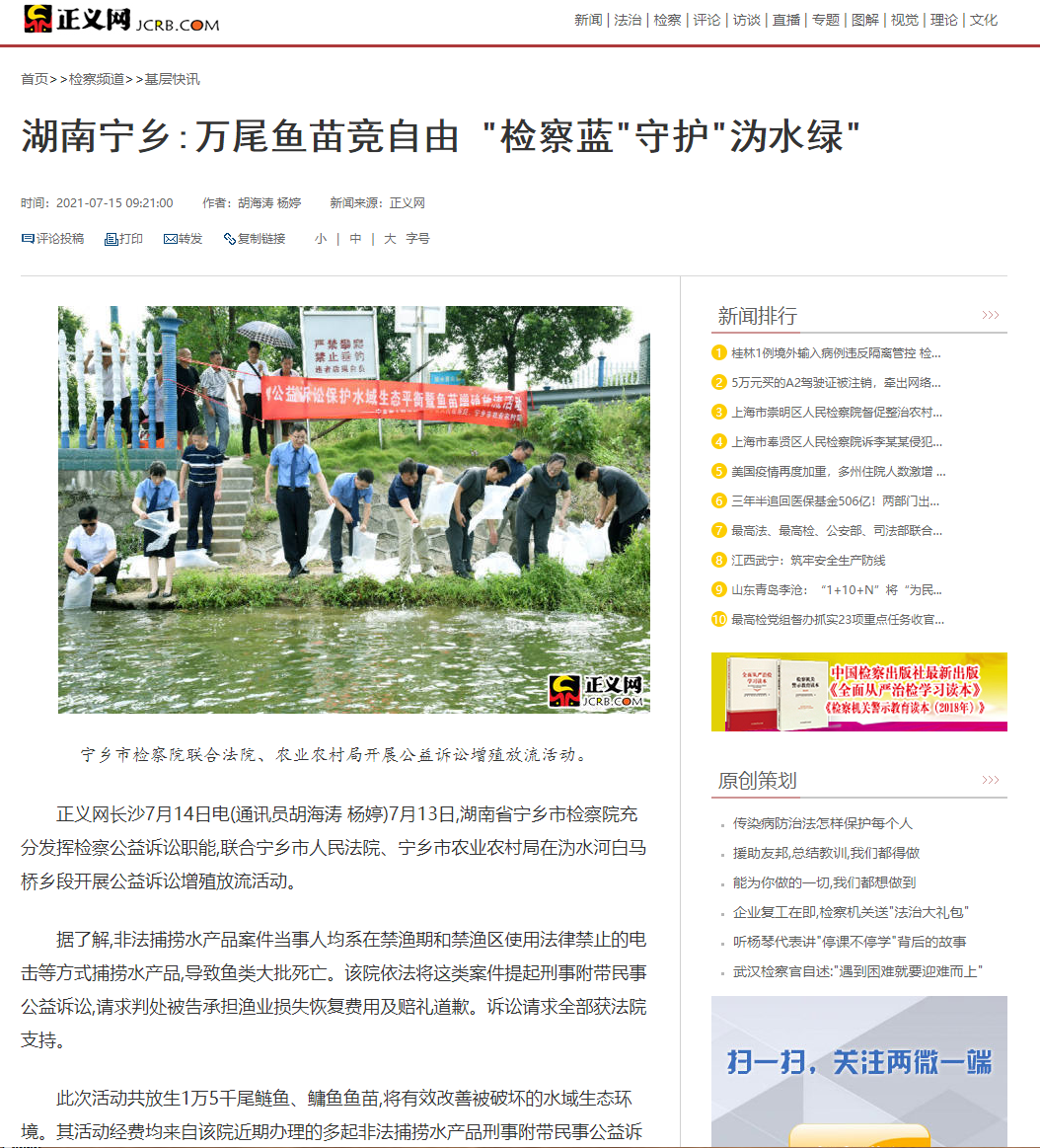 7月13日,湖南省宁乡市检察院充分发挥检察公益诉讼职能,联合宁乡市人民法院、宁乡市农业农村局在沩水河白马桥乡段开展公益诉讼增殖放流活动。