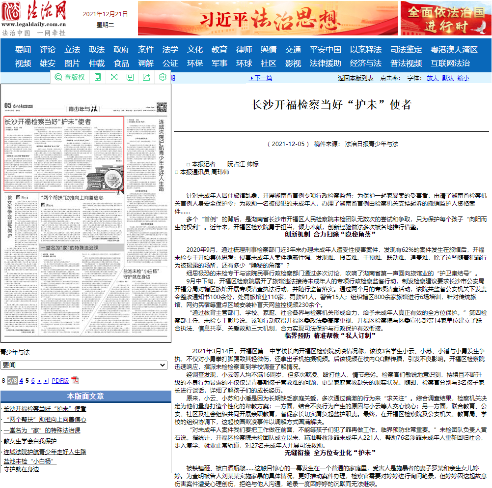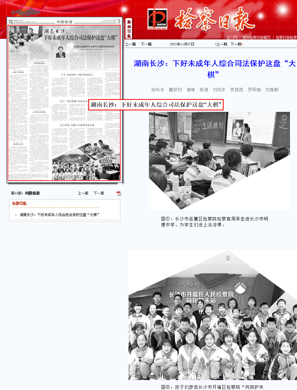 近年来,在习近平法治思想的引领下,长沙市检察机关主动服务中心大局,用心用情下好未成年人全面综合司法保护“一盘棋”,有效对接家庭、学校、社会、网络、政府、司法“六位一体”未成年人保护大格局建设,努力为未成年人健康成长营造良好的社会环境和法治环境。