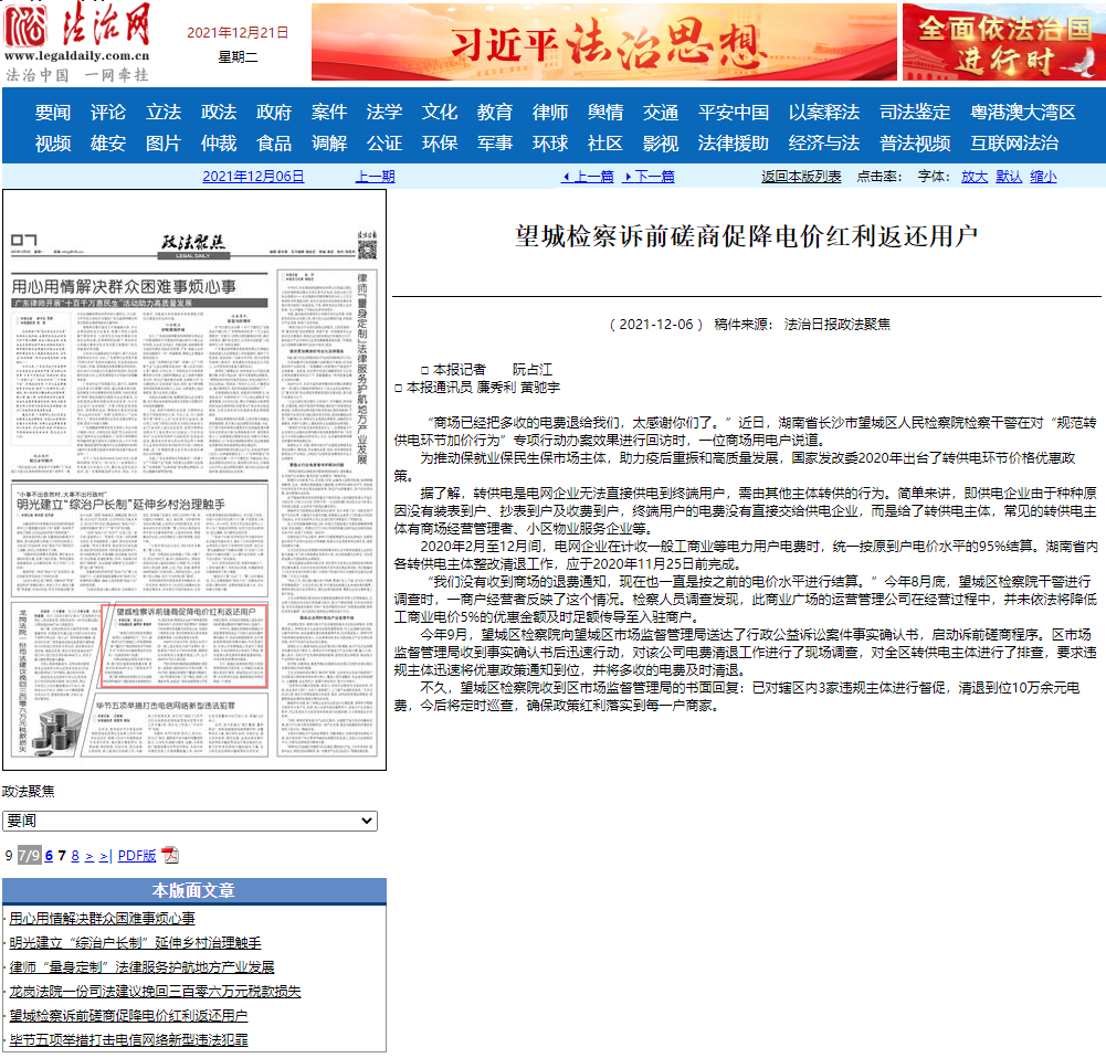 2021年9月,望城区检察院向望城区市场监督管理局送达了行政公益诉讼案件事实确认书,启动诉前磋商程序。区市场监督管理局收到事实确认书后迅速行动,对该公司电费清退工作进行了现场调查,对全区转供电主体进行了排查,要求违规主体迅速将优惠政策通知到位,并将多收的电费及时清退。