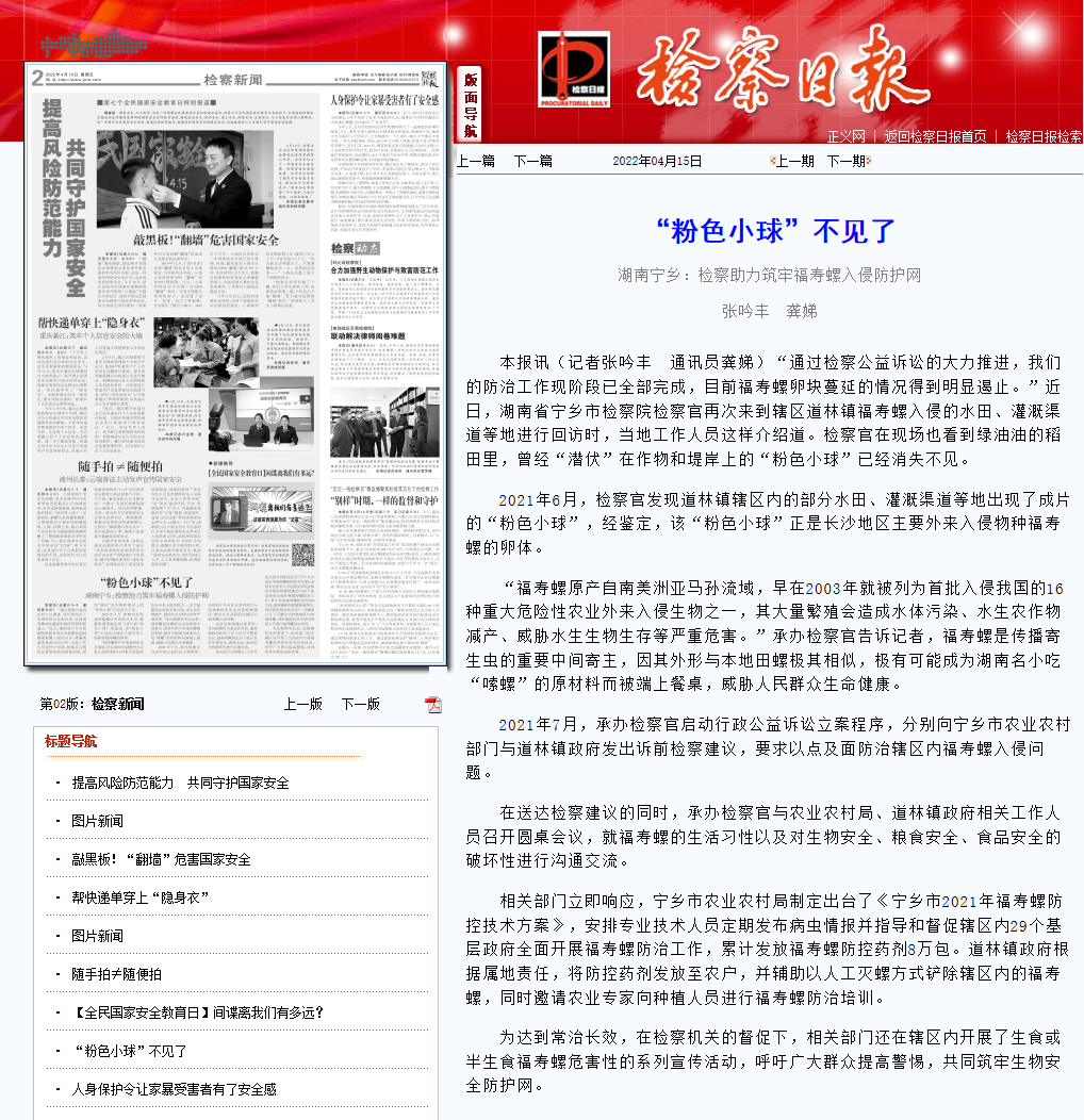 “通过检察公益诉讼的大力推进,我们的防治工作现阶段已全部完成,目前福寿螺卵块蔓延的情况得到明显遏止。”近日,宁乡市检察院检察官再次来到辖区道林镇福寿螺入侵的水田、灌溉渠道等地进行回访时,当地工作人员这样介绍道。检察官在现场也看到绿油油的稻田里,曾经“潜伏”在作物和堤岸上的“粉色小球”已经消失不见。