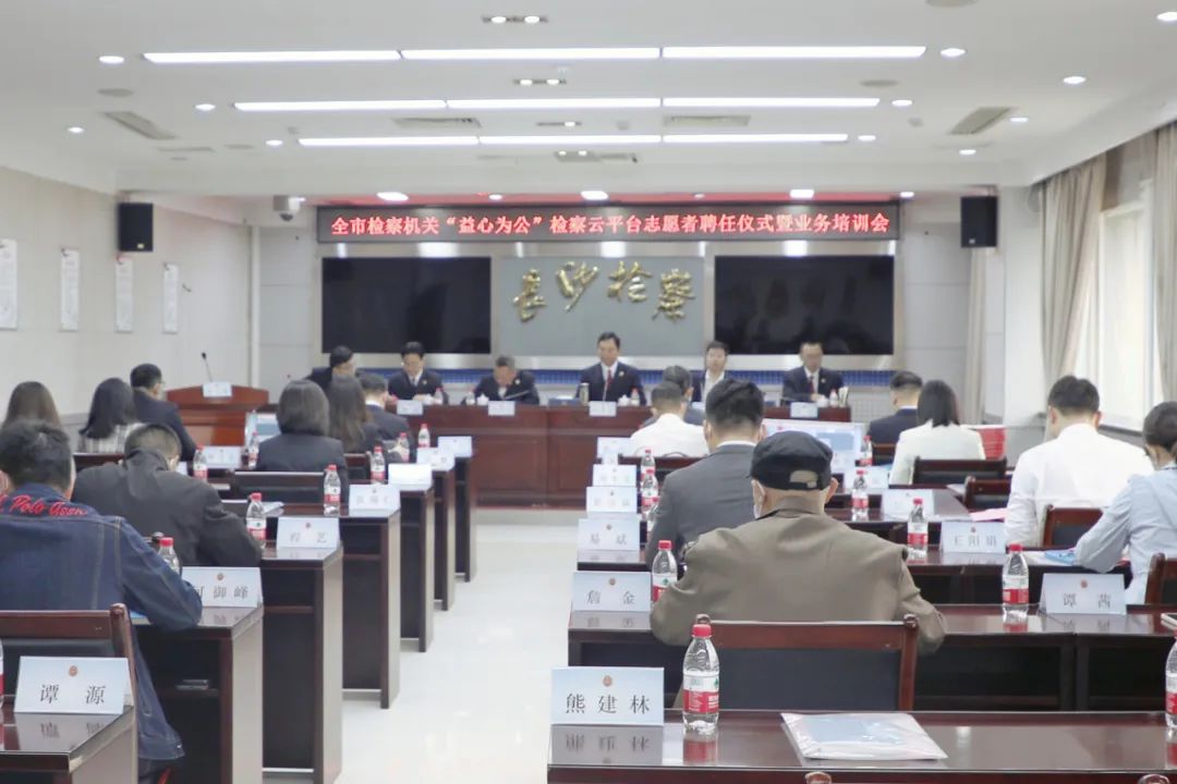 为广泛动员社会力量参与检察公益诉讼,共同维护国家利益和社会公共利益,全力打造多方参与、专业高效、共治共享的公益司法保护新模式,5月20日,长沙市两级检察院共同举行“益心为公”志愿者聘任仪式暨业务培训会,其中主会场设置在市检察院,分会场设置在各区县(市)检察院,聘任仪式在两级检察院会场同步进行。省检察院党组成员、副检察长刘清生、市委统战部副部长刘佳勇出席仪式并讲话,市检察院党组书记、检察长余湘文出席仪式并致辞,省检察院第八检察部主任陈忠出席仪式并给志愿者进行业务培训,来自市人大代表、市政协委员、统战系统、民主党派等方面的221名志愿者,以及两级检察院相关负责同志、全市公益诉讼检察干警参加聘任仪式。聘任仪式由市检察院副检察长廖耀群主持。