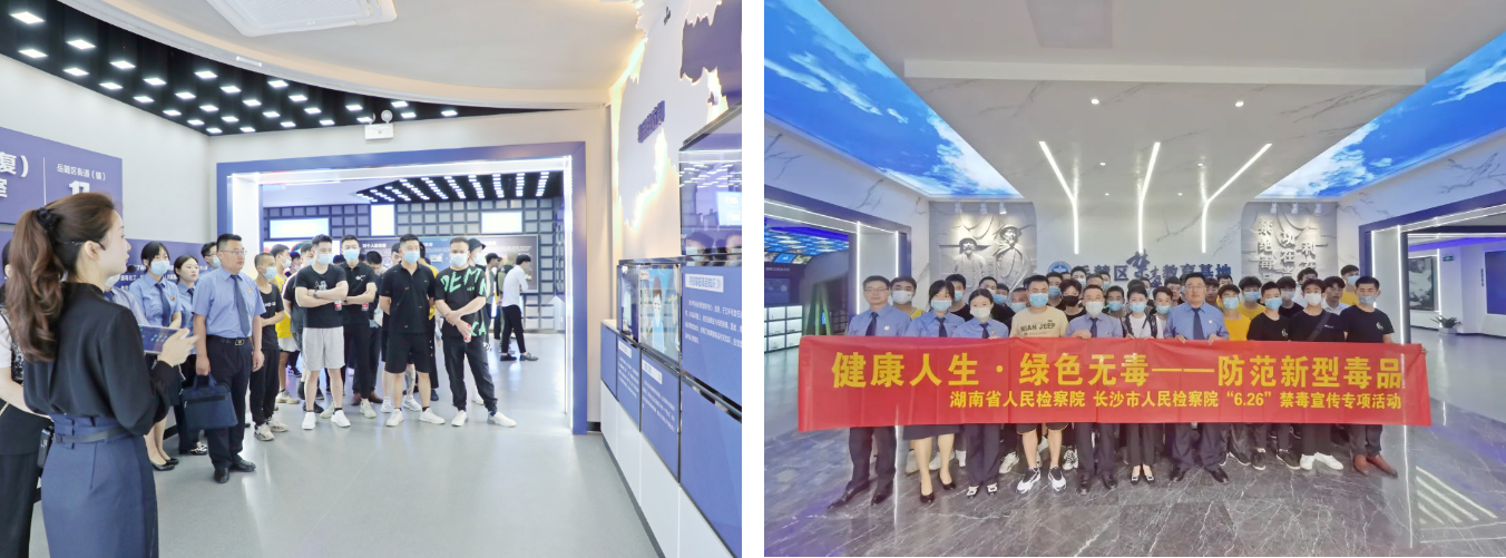 当天下午,在长沙市酒吧KTV商会和长沙市天心区社会禁毒协会娱乐行业禁毒分会的支持下,省检察院、市检察院另组织城区酒吧娱乐行业从业人员代表30余人参观了长沙市岳麓区禁毒教育基地。通过讲解员的讲解,大家了解了我国禁毒历史、湖南禁毒形势和长沙禁毒工作概况、传统毒品和新型毒品的种类和危害;观看了禁毒图片、视频影片;体验了“模拟吸毒人脸变化系统”,直观感受吸毒后人体的危害和变化;通过“禁毒知识在线问答系统”,学习了禁毒法律知识。
