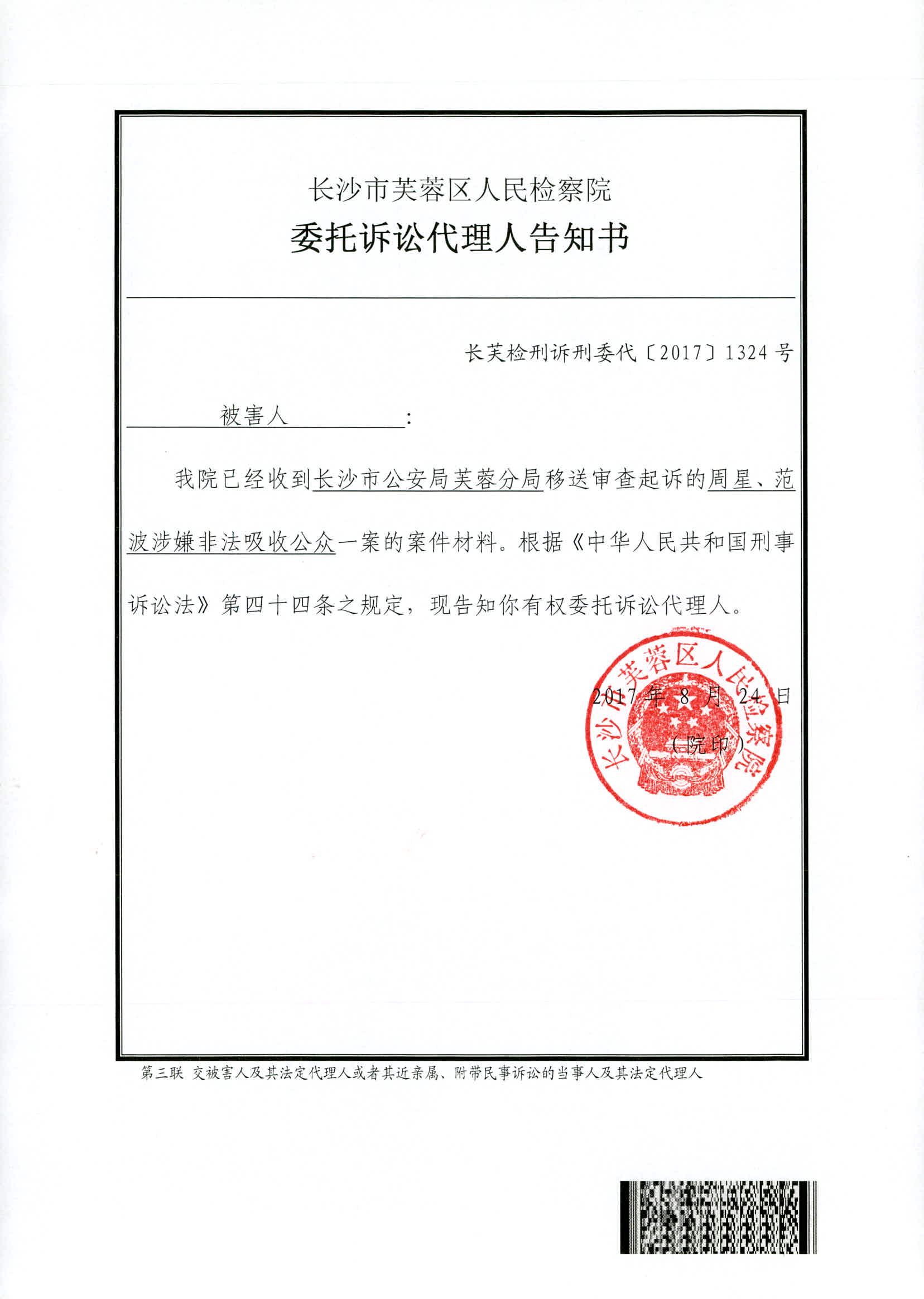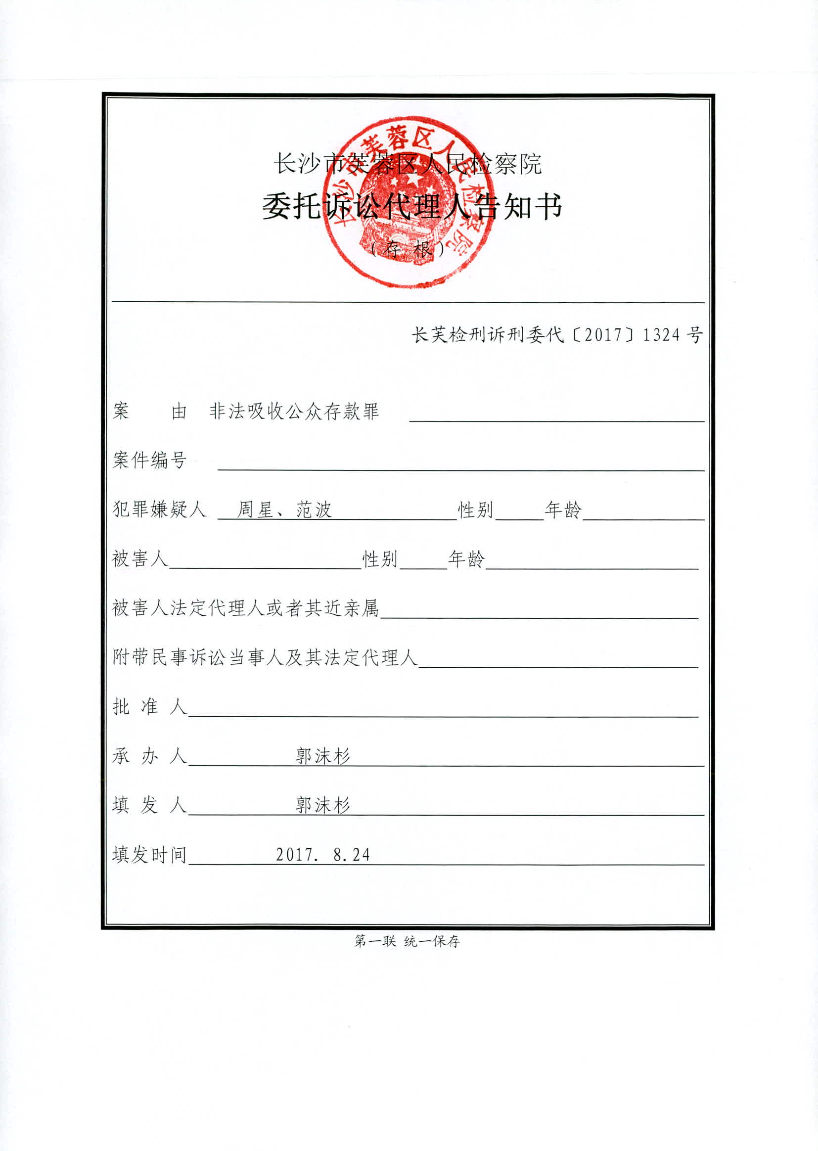 周星、范波涉嫌非法吸收公众存款案权利义务告知书