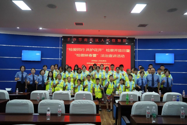 7月31日,湖南省检察院联合长沙市检察院、雨花区检察院、湖南省心馨公益助学促进中心,为来自宁乡市、浏阳市、长沙县及望城区的近200名“希望小屋”受助学生们,开展了一次主题为“检爱同行 共护花开”检察开放日暨“检徽映春蕾”暑期法治宣讲活动,让孩子们充分感受一次“检察蓝”的法治魅力。