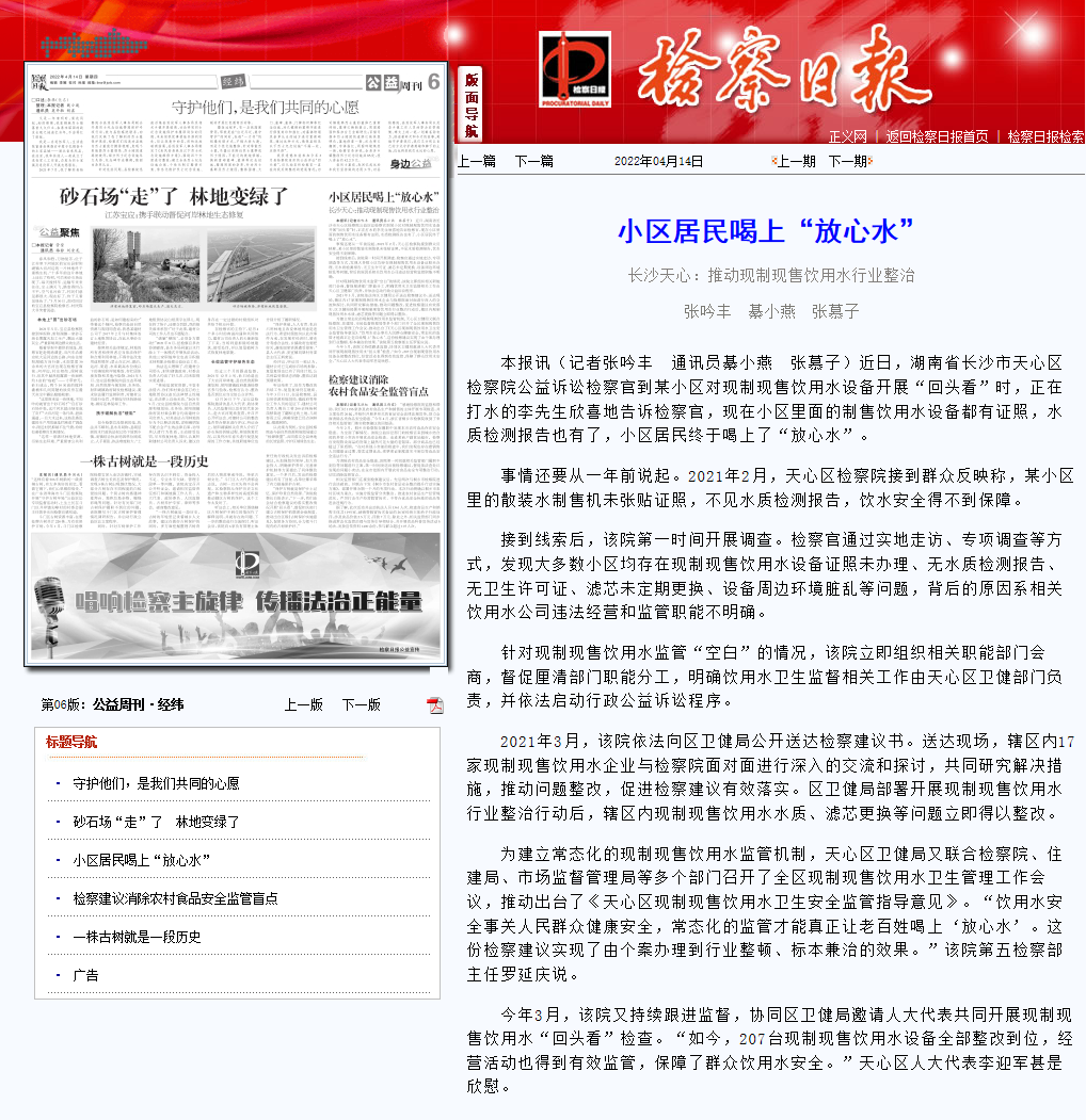 为建立常态化的现制现售饮用水监管机制,天心区卫健局又联合检察院、住建局、市场监督管理局等多个部门召开了全区现制现售饮用水卫生管理工作会议,推动出台了《天心区现制现售饮用水卫生安全监管指导意见》。“饮用水安全事关人民群众健康安全,常态化的监管才能真正让老百姓喝上‘放心水’。这份检察建议实现了由个案办理到行业整顿、标本兼治的效果。”该院第五检察部主任罗延庆说。