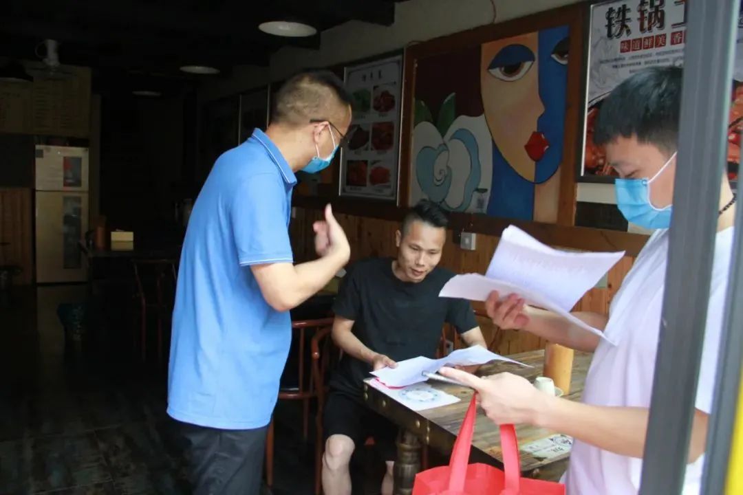 雨花区检察院的志愿者正在对商铺和企业发放《致雨花区各单位关于加强疫情防控工作的一封信》和《长沙市雨花区新冠病毒肺炎防控指挥部办公室通告》并签署回执单。