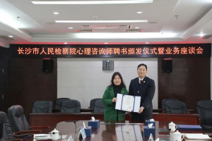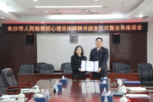 为贯彻落实习近平总书记“推进健康中国建设”“重视心理健康和精神卫生”的重要指示,进一步做好涉法涉诉信访矛盾化解工作,近日,长沙市检察院召开引入心理咨询专家参与信访矛盾化解试点工作座谈会,并聘任首批心理咨询专家参与检察机关涉法涉诉信访矛盾化解工作,5名心理咨询专家代表受邀参与座谈,长沙市检察院党组书记、检察长余湘文到会为受聘的心理咨询专家颁发聘书,市检察院副检察长廖耀群主持会议。