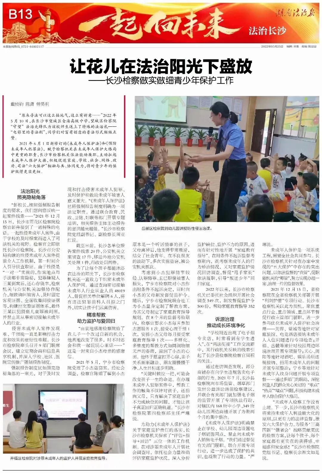 去年6月1日新修订的未成年人保护法和预防未成年人犯罪法,赋予了检察机关在未成年人保护大格局中更重的职责,长沙市检察机关依法能动履职,主动扛起未成年人保护“大旗”,积极促进“六大保护”相融与共、协同发力,将对孩子的保护做得更实更细。